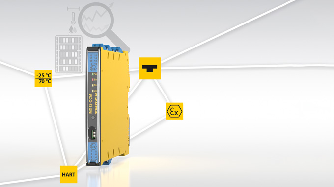 TurckはIMX12-CCM制御盤ガードを全面的にアップデートしました。従来の光センサ方式に代わり、押しボタンによるティーチインを採用し、より直感的な操作が可能になっています。動作温度範囲も+25~70℃へと拡張され、周辺機器や日射の影響で高温になりやすいリモートI/Oの制御盤内でも使用可能になりました。また、Ex領域で機器に電源を供給するアイソレーショントランスデューサとの互換性も改善され、Turck製に加えて他社製トランスデューサとも組み合わせて使用できます。