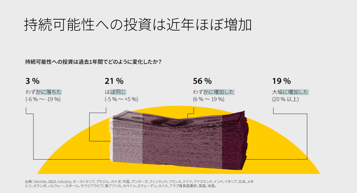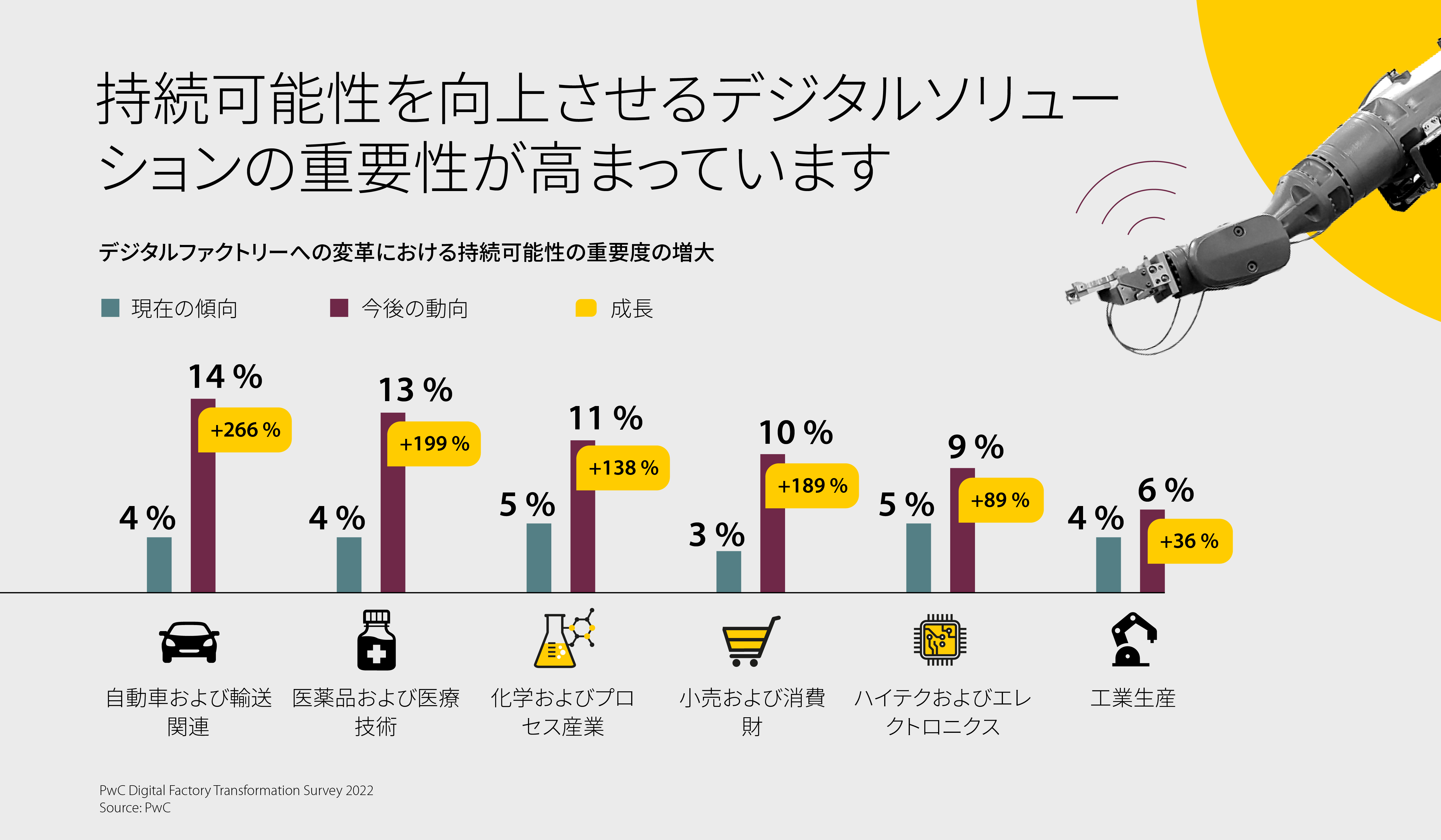 企業がデジタル技術を使用して生産プロセスの持続可能性を高める方法をご覧ください。オートメーション、人工知能、データ分析が主に貢献しており、売上と利益の大幅な増加がもたらされています。製造プロセスをより持続可能なものにするために、工業会社はデジタル技術にますます目を向けています。オートメーション(73 %)、人工知能(68 %)、データ分析(60 %)が、ここで最も一般的に使用されている技術の一部です。これらの技術の導入により、廃棄物の大幅な削減と同時に利益の増加につながりました。デジタル技術を使用している企業は、一般的に収益と利益の指標が改善しています。