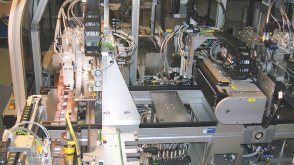 部品キャリアと対応するステーションには、タークのRFIDシステムが装備され、PROFIBUS-DPによって制御システムに接続されています。全体的に6つの読み書きポイントが現在システムに組み込まれています。1つは積載エリアのランプに、もう1つは3つのワイヤーボンダーの前にある保守ポジションに、もう1つは横送りに、もう1つは不合格を示すパンチの前に。”現在のシステムの拡張段階では、代替技術による部品キャリアの識別も処理できました”とHaraldGrünbauer社長は説明します。"このRFIDシステムはモジュール式であるので、システムを簡単にアップグレードすることが可能です。”