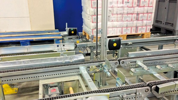 オスロ近くの食料品小売業者COOP Norge Handel社の新しい流通センターは、サッカーコートおよそ7つ分のサイズです。商品は流通センターの入出庫口にパレットに載せられて到着します。パレットはここで降ろされ、一時的にパレット棚に保管されます。次いで、混載されていないパレットは、完全にまたは半自動的に開梱され、トレイまたはコンテナに移されます。トレイとコンテナのほかに、物流センターでは2種類のパレットが使用されています:UHFタグが付いたプラスチック製パレットと、バーコードとUHFタグの組み合わせラベルの付いた木製パレットです。バーコードは、キャリアを木製パレットとして識別するために使用されます。トレイとコンテナは同様にバーコードによって識別されます。